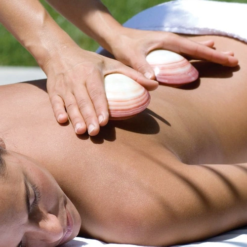 Masaža s toplimi školjkami je masaža celega telesa. Za sprostitev in za reševanje bolečinskih problemov, ki nastanejo ob nepravilni drži, oziroma pri nekontroliranih gibih. Školjke so naravne, neporozne, pridobljene iz Filipinov. Imajo zdravilni učinek na koži. Masaža s toplimi školjkami povrne koži lep, zdrav izgled. Pomaga pri obnovi celic kože in vrača napetost. Doseže se intenzivno topli učinek med samo masažo in še dolgo po njej, saj so školjke zelo tople. Zato je masaža s toplimi školjkami priporočljiva v zimskih dneh.
